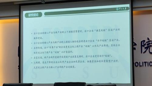 随后,黄新飞介绍了研究设计。他对变量选择和假设模型进行了详尽解释,采用投入-产出依赖度和投入-产出相似度两个指标,分别研究上下游延链和水平延链的情况。通过统计描述和稳健性检验,展示了实证研究的主要结果。他还从核心产业比较优势和新产业国际需求两个角度,阐释了企业出口“延链”的原因,并在产业和企业两个层面进行了异质性分析。最后,黄新飞分享了研究结论,并提出了相关政策建议。